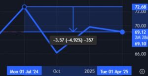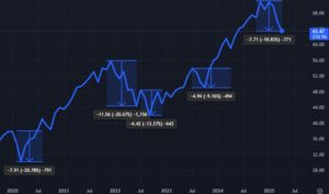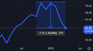 The above chart tracks a similar number, but instead of US companies, it measures how stocks in foreign countries are performing. We see that the decline has been much more gradual, only around 5% from the peak in July, and it has barely dropped at all since inauguration. Many of you have a chunk of your portfolio invested in this as well (called IXUS, IEFA, SCHF or VEA) which has protected us from bigger losses in US stocks.